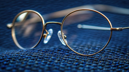 This close-up image showcases stylish round glasses on a textured blue fabric background, highlighting modern design and aesthetic charm perfect for lifestyle themes.