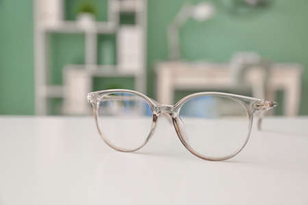 Eyeglasses on table in ophthalmology clinic