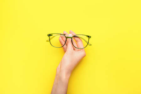 Female hand with stylish eyeglasses on yellow background
