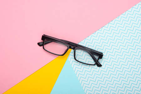 Eyeglasses on a pastel colored background. Top view