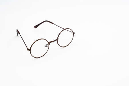 Round optical glasses on a white background.