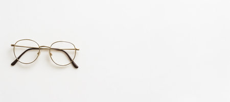 Vintage round glasses with golden frame on white background. concept of minimalist style, fashion accessory, optical eyewear design, banner, copy space.