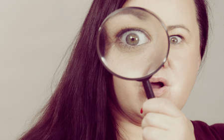 Adult woman holding magnifying glass investigating something and looking closely, trying to find solution.