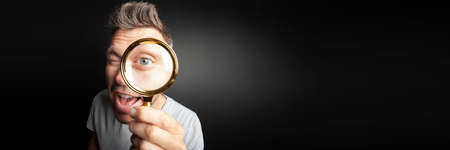 Young handsome man and a magnifying glass on a black background in low key. Search symbol. Investigation concept