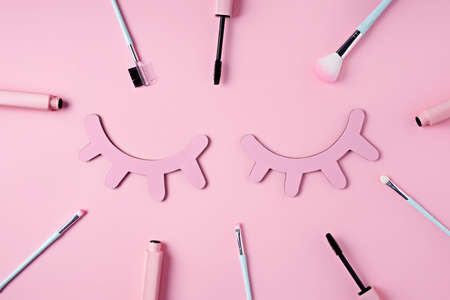 Eyelashes surrounded with mascara and brushes on pastel pink background. Minimal make up salon, beauty or cosmetic studio concept. Vogue visual trend. Flat lay, top view.