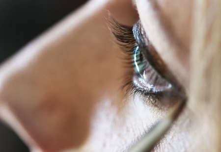 Closeup detail of womans eyelid and eyelash applying makeup eyeliner