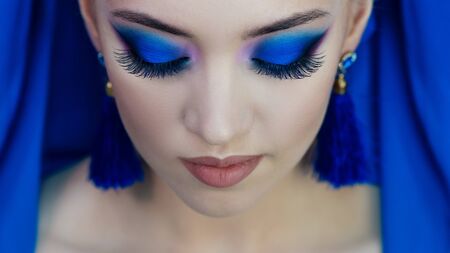 Glamorous bright eye makeup using the trend color classic blue, women's eyes close-up. One tone look with tassel earrings