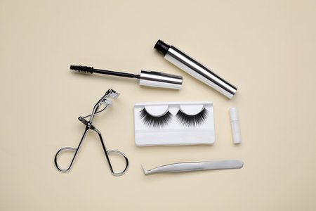 Flat lay composition with fake eyelashes on beige background