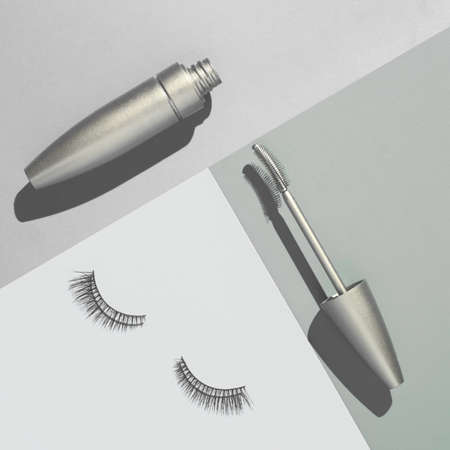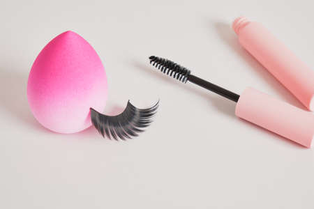 eyelashes makeup. Mascara, sponge and false eyelashes on gray background top view copy space