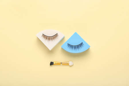 Flat lay composition with false eyelashes on yellow background