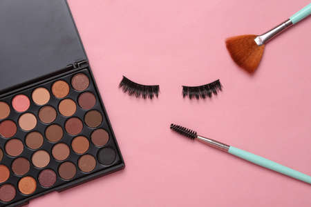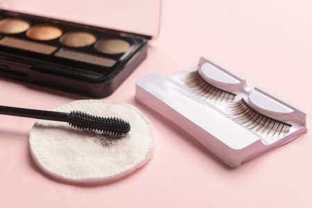 Eyeshadows, mascara, false eyelashes and used cotton pad on pink background, closeup