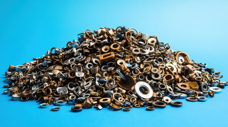 This image captures a vibrant and textured pile of various metal washers, nuts, and bolts against a bright blue background, highlighting industrial design.