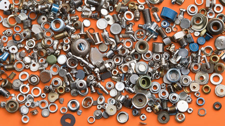 This image features a vibrant arrangement of various metallic fasteners and hardware components, perfect for illustrating tools, industry, or DIY projects.