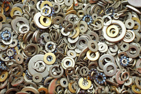 Steel washers on metallic background directly above
