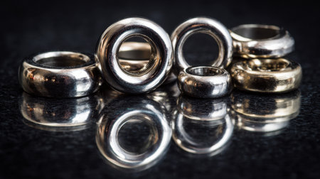 A stunning close-up of assorted metallic rings arranged artistically on a glossy black surface, highlighting their shine and unique textures, ideal for showcasing jewelry design.