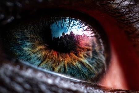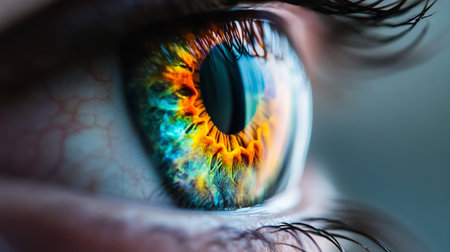 Close-up image of human eye with striking detail, capturing vibrant colors and intricate patterns iris