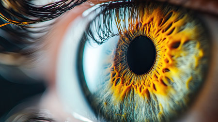 Intricate details of a vibrant human eye, showcasing blue and yellow pigmentation with reflections on the cornea. fine eyelashes frame the eye, highlighting the texture and vivid coloration of the iris and the clarity of the gaze.