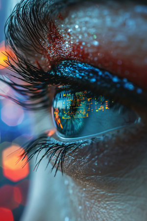 A detailed close-up of a human eye with reflections of lights and surroundings, highlighting intricate patterns and colors.