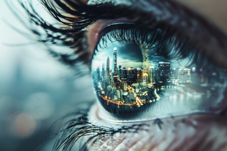 A striking reflection of a bustling city is visible in the eye of an individual, highlighting the vibrant lights of skyscrapers at night and capturing a sense of urban energy.