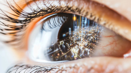 Close-up of a human eye with a digital interface overlay, symbolizing vision and technology, with ample space for text.