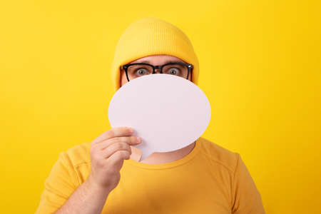 Fat man smiling in yellow t-shirt on yellow background isolated AI