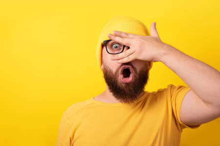 Close-up portrait of a man with a shocked expression against a yellow background. His eyes are wide, and his mouth is open in surprise.