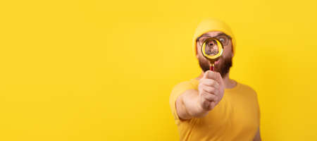 shocked man looking through magnifier glass over yellow background, panoramic image