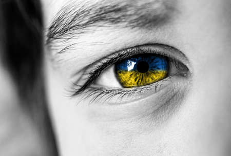 Big beautiful eye close-up. Blue and yellow colors iris. Concept of war in Ukraine. Caucasian appearance. emotional stress. Pain, sadness and sorrow. bad mood. Unhappy childhood. Loneliness. abuse. Woe.