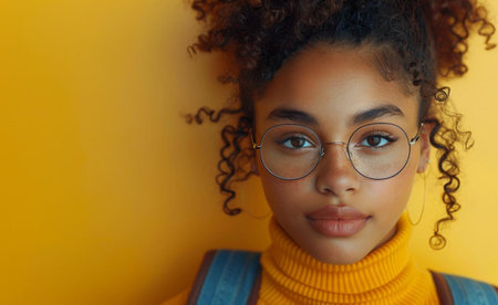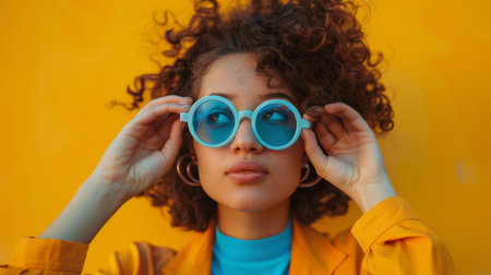 A young woman with curly hair and vibrant blue glasses poses against a bright yellow background, expressing bold fashion and individuality.