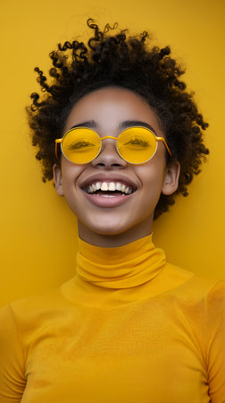 smiling woman yellow sunglasses turtleneck top light skinned african young girl depths joy robed cultist aviators, generative ai