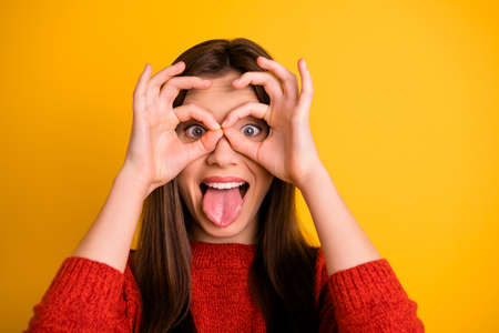 Back to childhood concept. Close up photo of funny funky hipster lady show ok sign make binoculars from fingers look with tongue out have fun fooling, wear red sweater isolated yellow color background