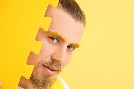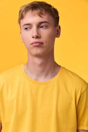 Male model wearing a yellow shirt stands against a vibrant yellow backdrop, looking off to the side with a calm, thoughtful expression in a clean studio setting.