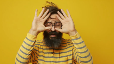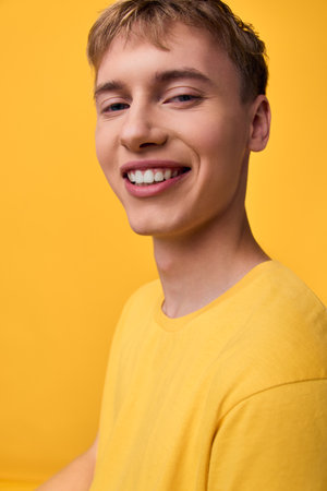 Smiling man in a bright yellow shirt against a yellow studio backdrop, creating a vibrant, cheerful image suitable for lifestyle, fashion, and upbeat branding campaigns