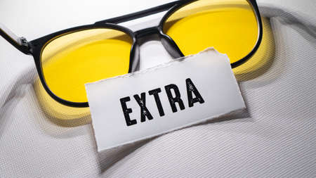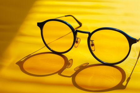 Close-up of yellow transparent sunglasses on white striped background by shadows.