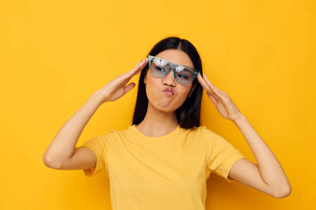 cheerful woman in yellow t-shirt and stylish glasses posing fashion