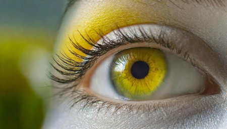 Extreme close up view of a womans eye with a vibrant yellow and orange iris, showing intricate detail