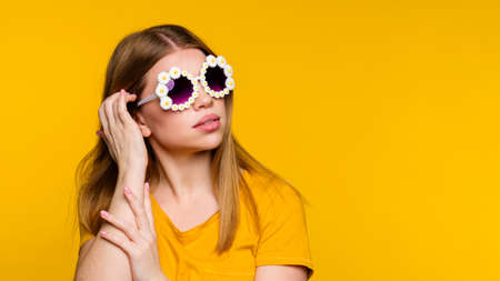Close up portrait girl in basic bright yellow wear in stylish sunglasses with daisies against yellow wall. Nice young woman looks away and dreams. Concept arrival spring. Copy space