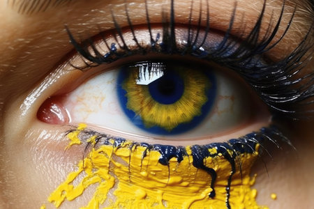 A close-up of a woman's eye colored yellow and blue. A concept of the problems faced by Ukrainians, a symbol of patriotism. Generative AI.