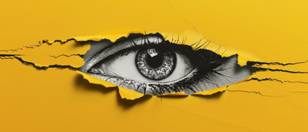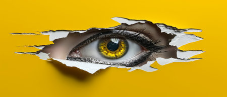 A close-up view of a person's captivating eyes peeking through a torn vibrant yellow fabric showcasing a mysterious and intense expression.