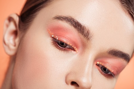 close-up of eye make-up with lashes. detail of beautiful eyes glitter evening makeup