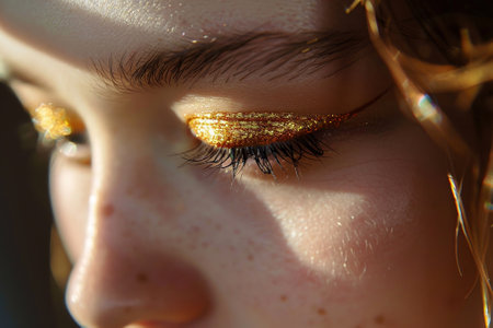 Close-up of a caucasian woman with sparkling golden eyeshadow revealing vibrant eye makeup. concepts of beauty, mesmerizing gaze, detailed artistry.