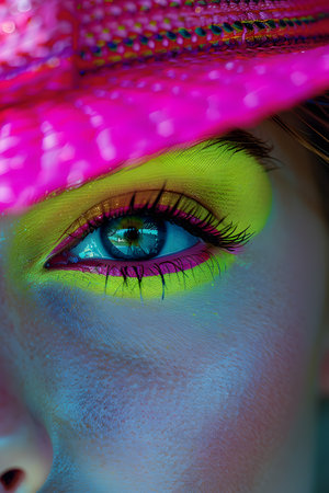 A closeup of a womans face with vibrant neon makeup, embodying bold fashion and artistic expression