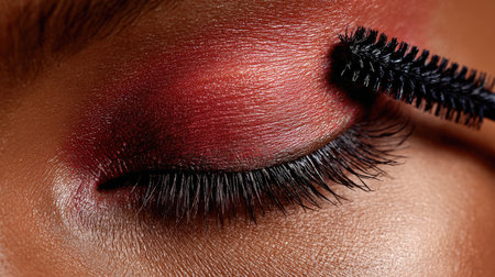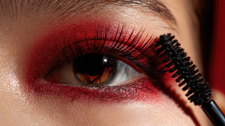 A stunning close-up image showcasing eye makeup application with vibrant red eyeshadow and mascara, highlighting long lashes and detailed textures.