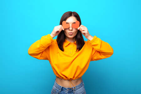 amazing looking mixed races woman with funny face covering her eyes with valentines red hearts giving a kiss
