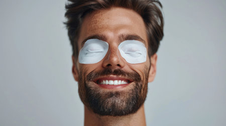 A millennial guy with brown hair practicing skincare with under eye hydrogel patches in a studio. Young caucasian man smiling, absorbing the ingredients of the cosmetic under eye mask. Mens skincare.