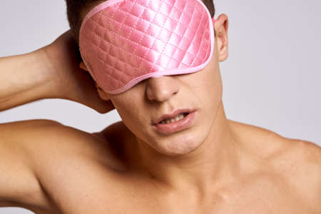 A man in a pink mask for sleeping on a light background at night gestures with his hands