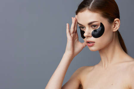 portrait woman with patches on the face clean skin health rejuvenation Gray background