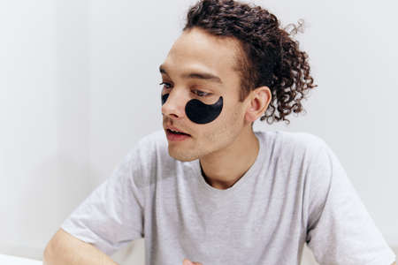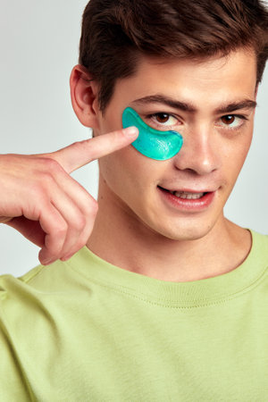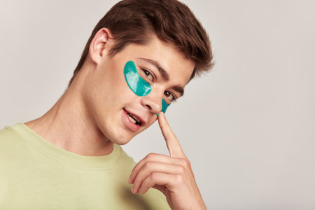 A millennial guy with brown hair practicing skincare with under eye hydrogel patches in a studio. Young smiling caucasian man applying cosmetic patches on his face. Mens self-care.
