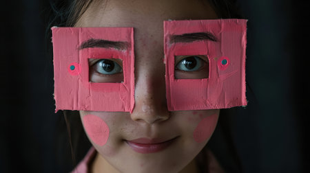 Young Asian woman with paper on her face looking at camera.