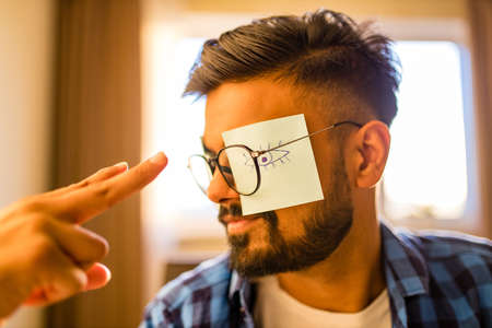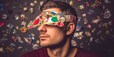 Image of a young man with Christmas stickers covering his eyes. Fun and festive theme. Can be used for Christmas promotions or social media promotions.